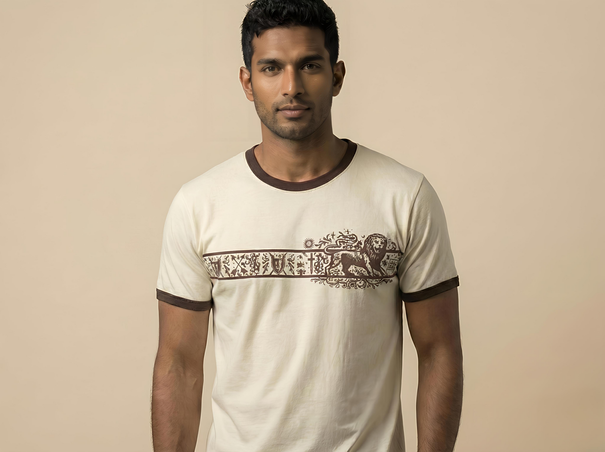 Elevate your street wear game with the Lion Heritage graphic tee. Premium cream cotton features vintage-inspired lion artwork with ornate border details and bold brown contrast trim. Regular fit design delivers all-day comfort while making a statement.