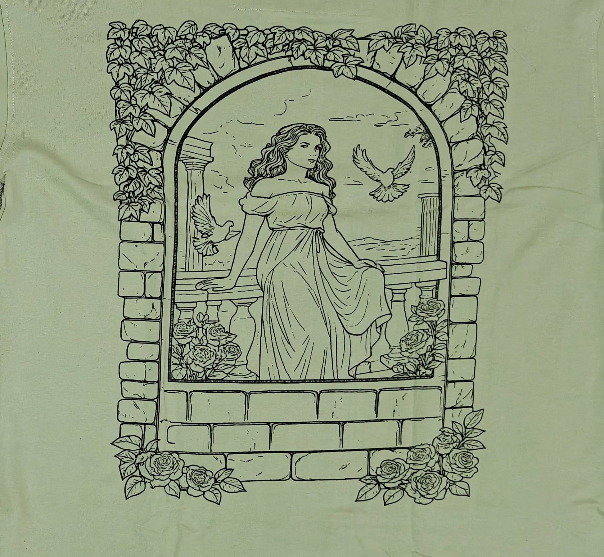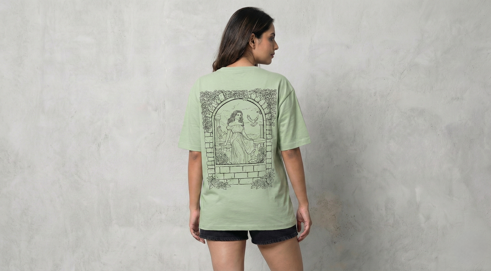 Sage green oversized t-shirt with rose and butterfly artwork. Vintage-inspired back print, designed in India. Comfortable, aesthetic street wear for the modern woman who values style and authentic art-driven fashion without compromise.